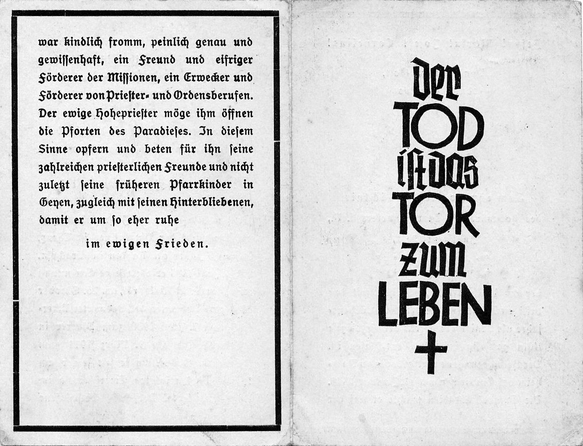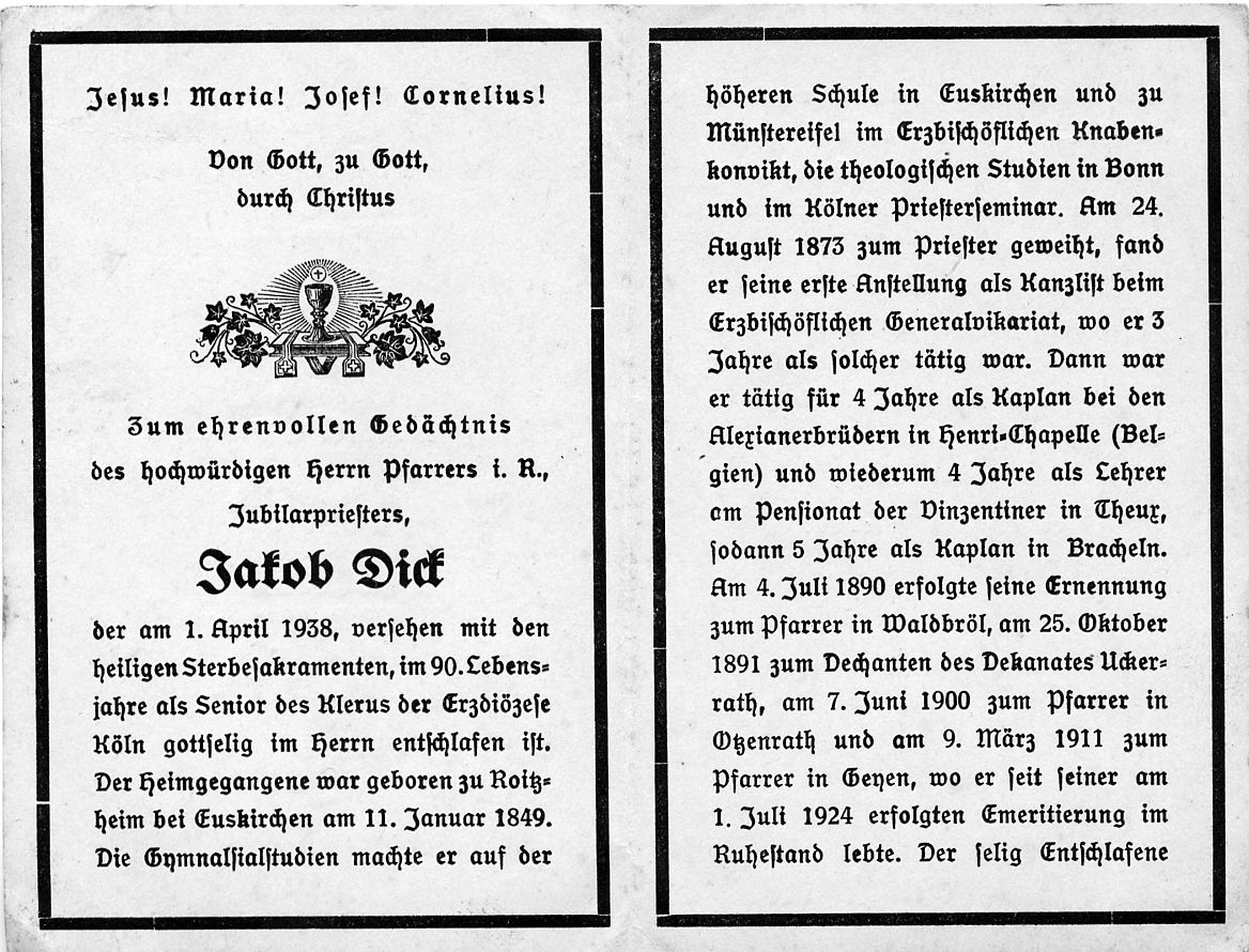 Priesterweihe 24.8.1873; 3 J. Kanzlist im Generalvikariat; 4 J. Kaplan in Henri-Chapelle, Belgien; 4 J. Lehrer im Pensionat in Theux; 5. J. Kaplan in Bracheln; 4.7.1890 Pfarrer in Waldbröl, 7.6.1900 in Otzenrath, 9.3.1911 in Geyen; dort seit 1.7.1924 im Ruhestand |