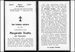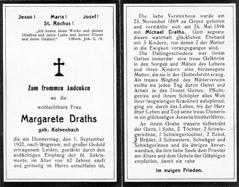 | Längeres Leiden; ∞ 24.5.1896 Michael Draths; 5 K., davon 2 †; Mitgl. Mütterverein |