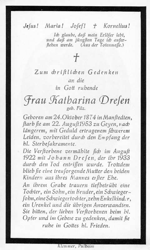 | Längeres, schweres Leiden; ∞ 1922 Johann Dresen ( 2 K. aus 1. Ehe), † 1933 |