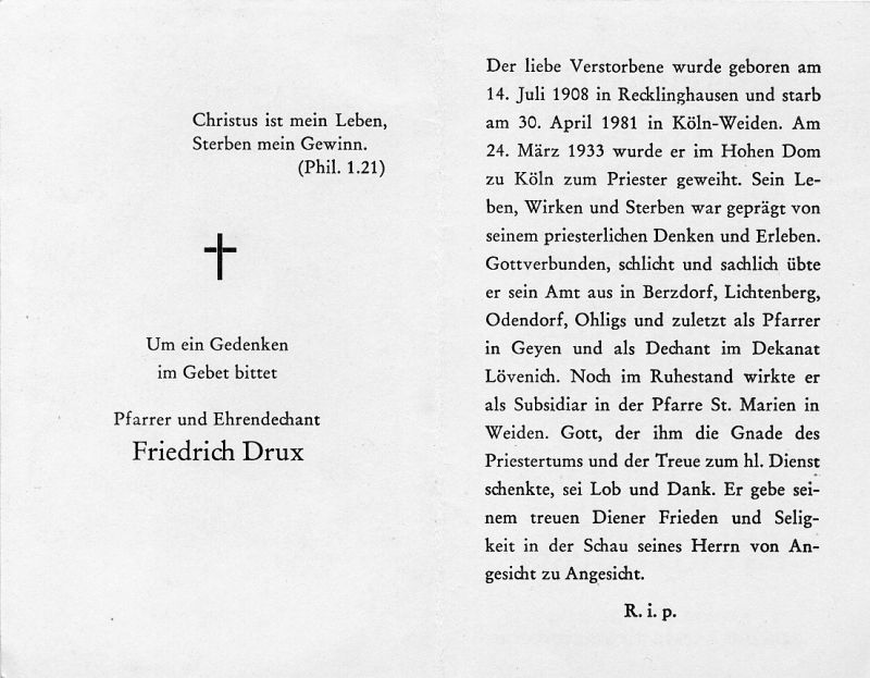 | Priesterweihe Köln 24.3.1933; tätig in Berzdorf, Lichtenberg, Odendorf, Ohligs, zuletzt Pfarrer in Geyen; Dechant; im Ruhestand Subsidiar an St. Marien in Weuden |