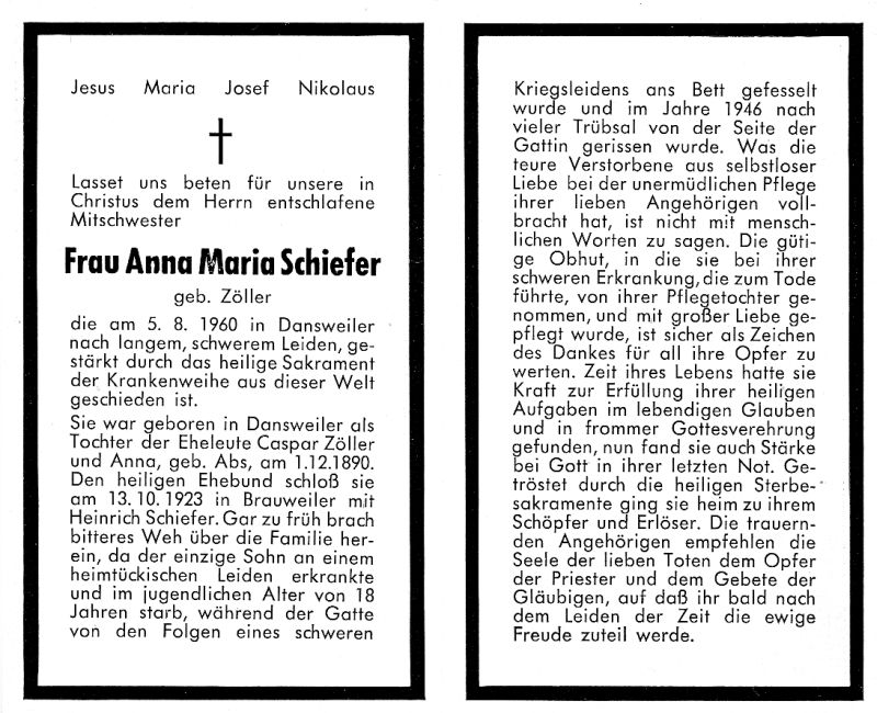 Eltern: Caspar Zöller u. Anna geb. Abs; ∞ 13.10.1923 in Brauweiler Heinrich Schiefer; einziger Söhn mit 18 J. †; Gatte durch Kriegsleiden ans Bett gefesselt (Opfer 1. Weltkrieg), † 1946; langes Leiden |