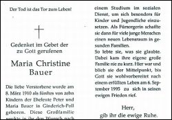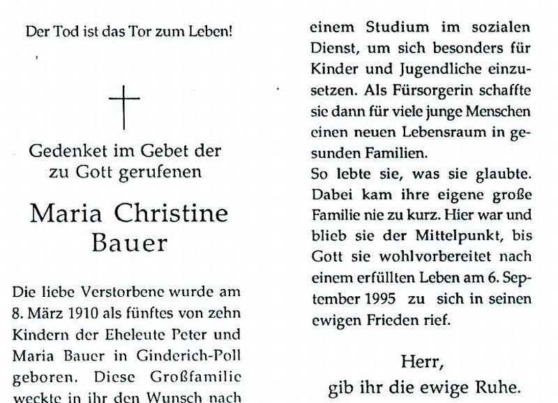 | Eltern: Peter u. Maria Bauer in Ginderich-Poll; 5. von 10 K.; Beruf: Fürsorgerin |