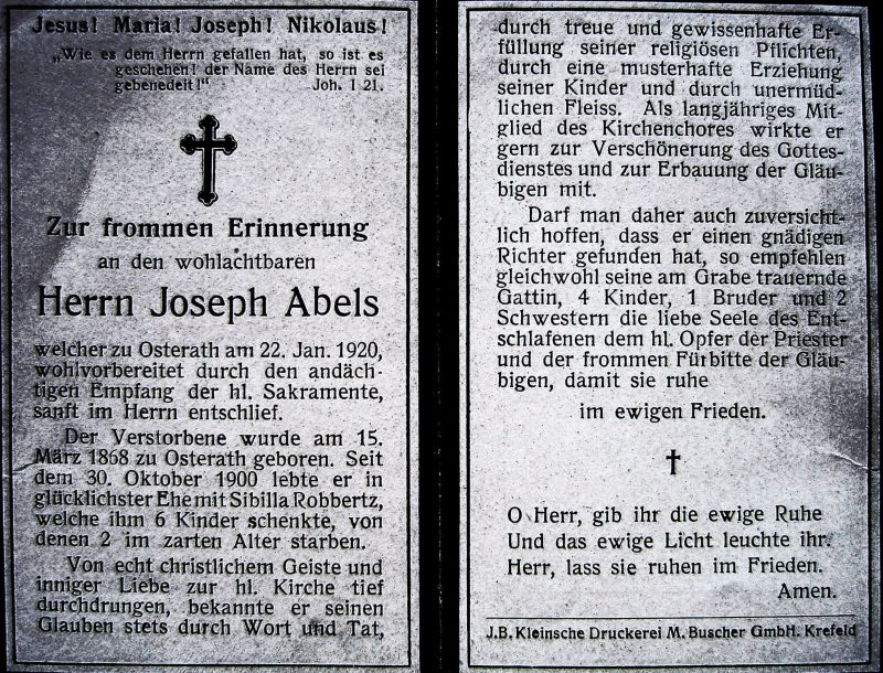 ∞ 30.10.1900 Sibilla Robbertz; 6 K., davon 2 früh †; Mitgl. Kirchenchor |