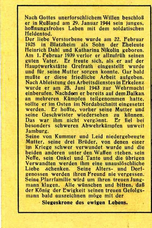 | Gefallener 2. Weltkrieg; Eltern: Heinrich Dahl († 1.2.1939) u. Katharina geb. Nikolin; eingestellt auf Hauptwerkstätte Grefrath; 25.6.1943 Einberufung |