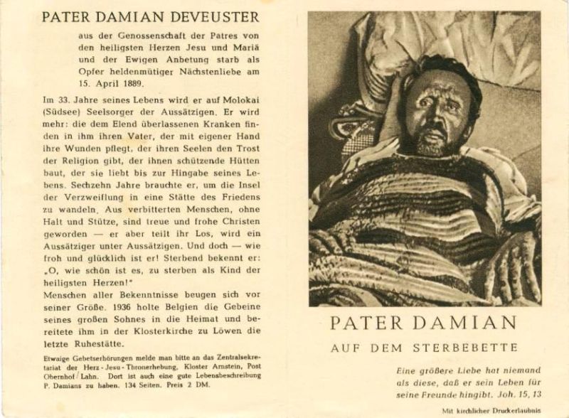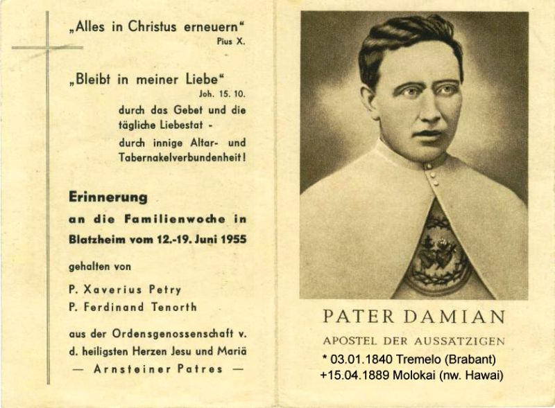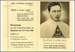 | Ordenspriester; 33 J. Seelsorger der Aussätzigen auf Molokai (Südsee); wandelte die Insel der Verzweiflung in eine des Friedens; 1936 Ruhestätte in Klosterkirche zu Löwen |