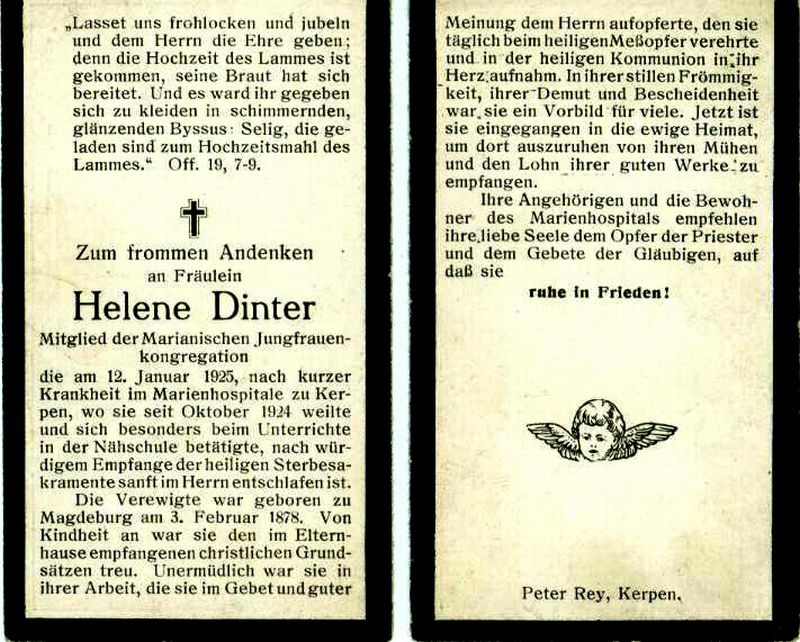 | Fräulein; seit 1924 im Marienhospital Kerpen, wo sie sich besonders beim Unterricht in der Nähschule betätigte |