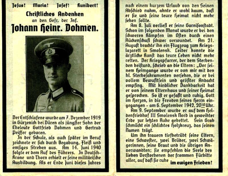 | Gefallener 2. Weltkrieg; Eltern: Gottfried Dohmen u. Gertrud geb. Peiffer; 14.6.1940 Einberufung; 8.7.1942 durch Rückenschuß schwer verwundet; mit Flugzeug ins Lazarett Smolensk; Heldenfriedhof III Smolensk |
