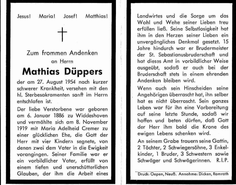 | ∞ 8.11.1919 Maria Adelheid Cremer; 4 K., davon 2 †; Landwirt; 15 J. Brudermeister der St. Sebastianus-Bruderschaft |