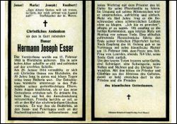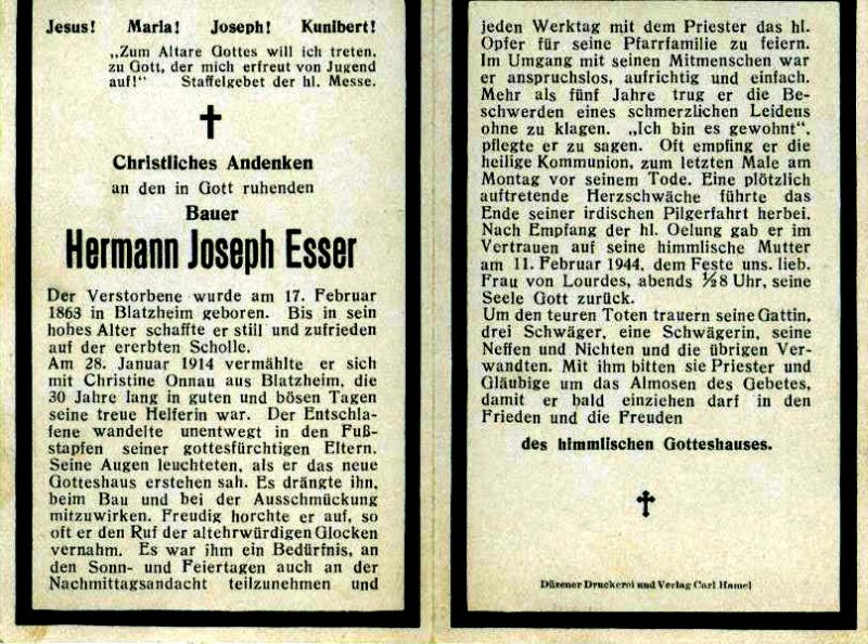 Bauer; ∞ 28.1.1914 Christine Onnau aus Blatzheim; wikte beim Neubau und der Ausschmückung der Kirche mit; 5 J. leidend |
