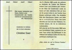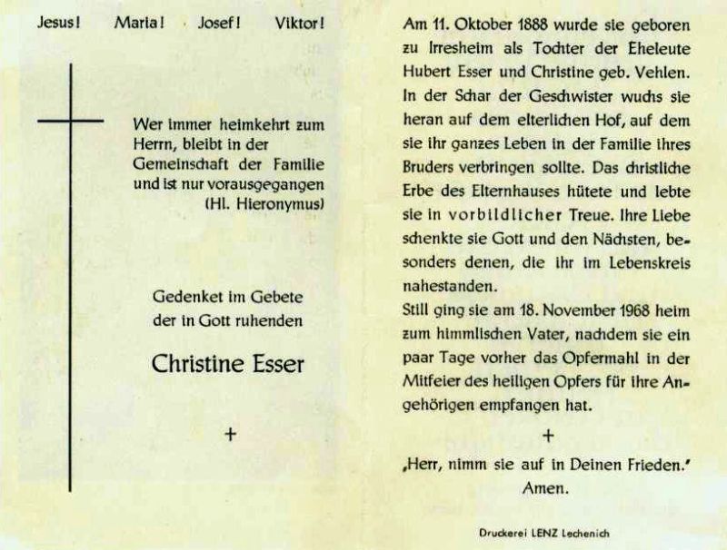 | Eltern: Hubert Esser u. Christine geb. Vehlen; verbrachte ihr Leben auf dem elterlichen Hof und in der Familie des Bruders |