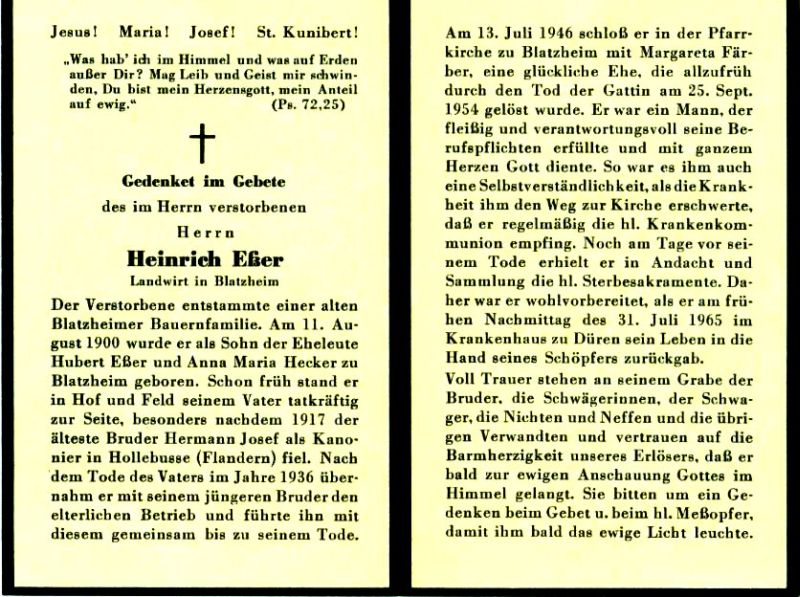 | Landwirt; Eltern: Hubert Eßer u. Anna Maria geb. Hecker; ältester Bruder im 1. Weltkrieg 1917in Flandern gefallen; übernahm 1936 mit jüngerem Bruder Hof des Vaters; ∞ 13.7.1946 Margareta Färber, † 25.9.1954 |