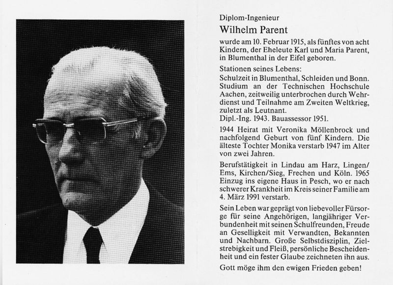 Dipl.Ing. 1943, Bauassessor 1951; ∞ Veronika Möllenbrock; 5 Kinder, davon verstarb Tochter Monika mit 2 J.; 1965 Einzug ins eigene Haus in Pesch |