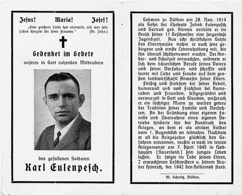 Gefallener 2. Weltkrieg; Eltern: Jakob Eulenpesch u. Gertrud geb. Siemes, beide verstorben; 11 Geschwister; 2 erw. Geschw. Verstorben; Bruder Heinrich 1942 im 2. Weltkrieg gefallen |