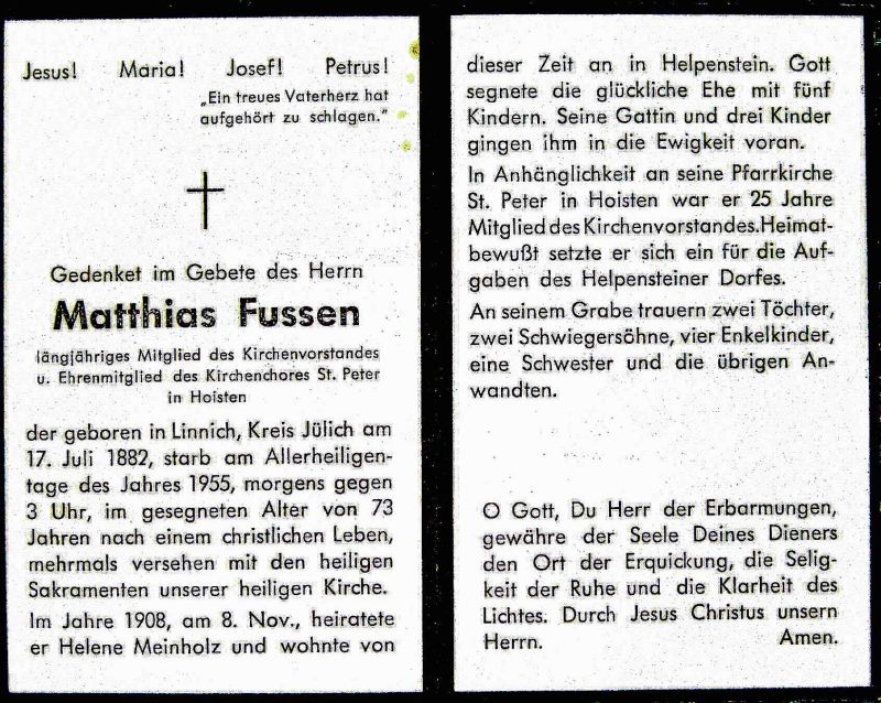 ∞ 8.11.1908 Helene Meinholz, † ; wohnte seit der Ehe in Helpenstein; 5 K., davon 3 †; 25 J. Mitgl. d. Kirchenvorstandes St. Peter in Hoisten |