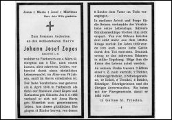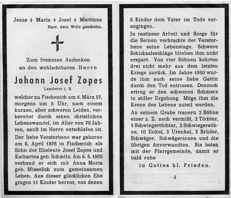 Landwirt i.R.; Eltern: Josef Zopes u. Katharina geb. Schmitz; ∞ 6.5.1905 Anna Maria Misselich, † 1950; 11 K., davon 8 †; 2 Söhne im 2. Weltkrieg gefallen, 1 Sohn noch vermißt |