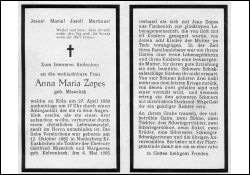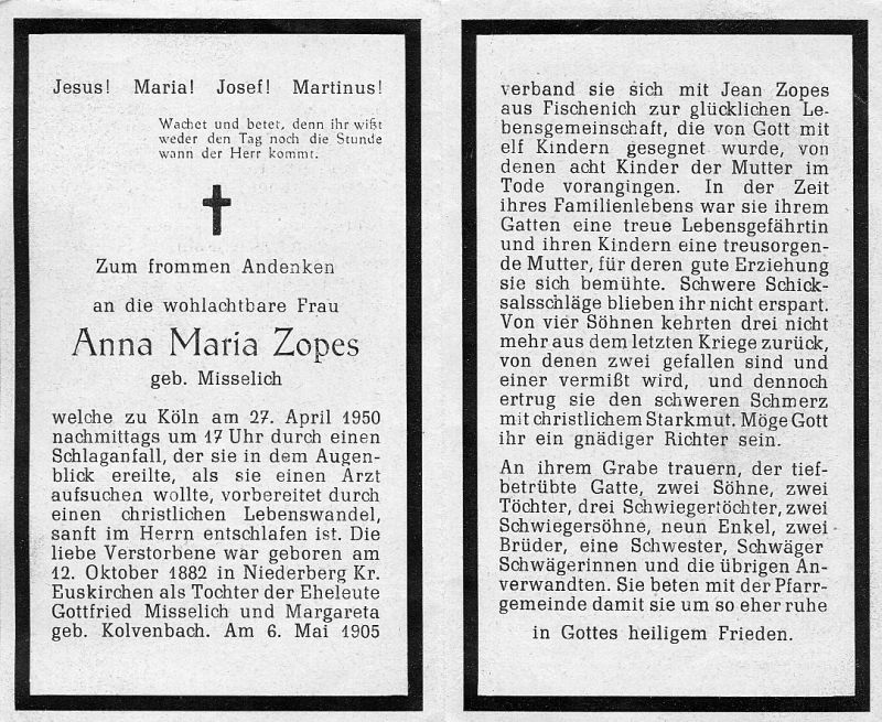 Wohnort Fischenich, in Köln zu Arztbesuch; Eltern: Gottfried Misselich u. Margareta geb. Kolvenbach; ∞ 6.5.1905 Jean Zopes aus Fischenich; 11 K., davon 8 †; 2 Söhne im 2. Weltkrieg gefallen, 1 Sohn vermißt |