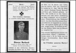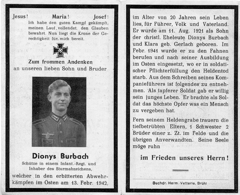 Gefallener 2. Weltkrieg; Eltern: Dionys Burbach u. Klara geb. Gerlach (Druck in Brühl) |