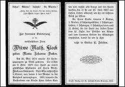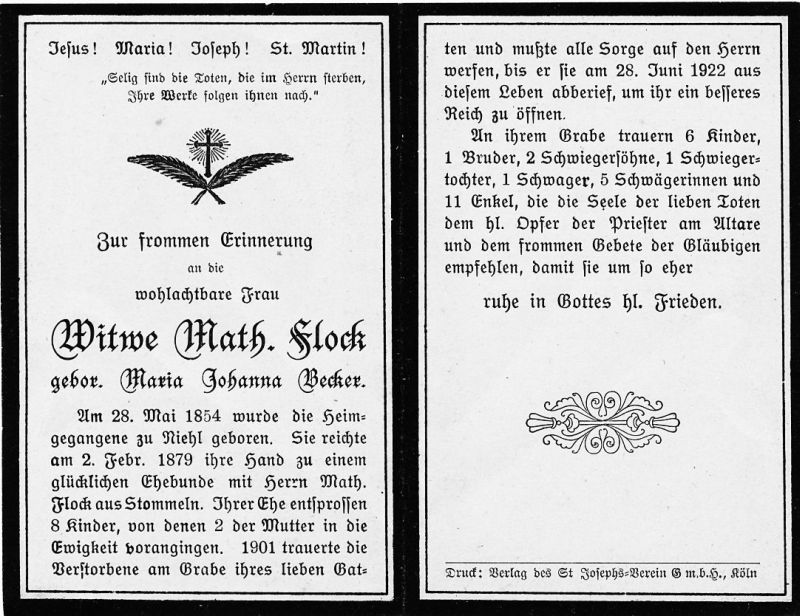 ∞ 2.2.1879 Mathias Flock aus Stommeln, † 1901; 8 Kinder, davon 2 verstorben |