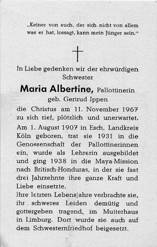 1931 Eintritt in Genossenschaft der Pallottinerinnen; Lehrerin; 1938 in die Maya-Mission in Britisch-Honduras, wirkte dort 3 Jahrzehnte; letzte Lebensjahre im Mutterhaus in Limburg |