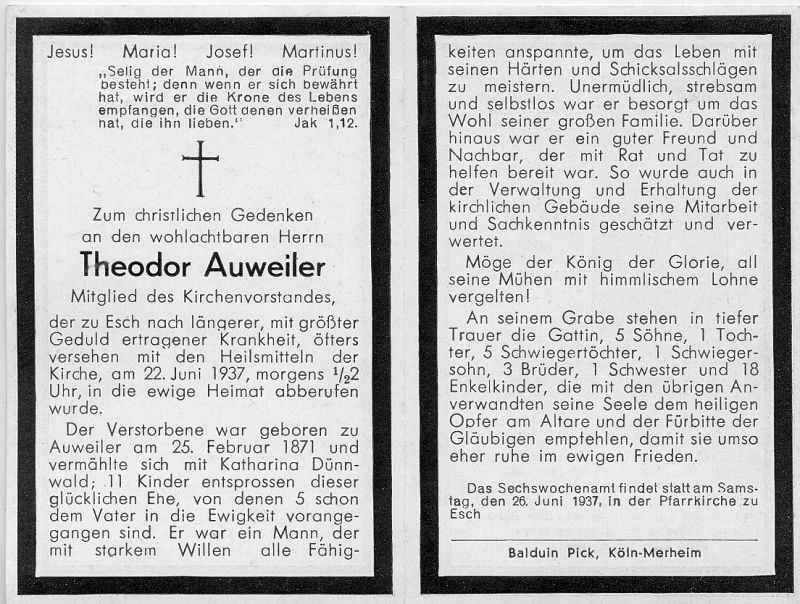 Mitgl. d. Kirchenvorstandes; längere Krankheit; ∞ Katharina Dünnwald; 11 K., davon 5 †; |