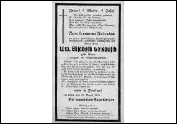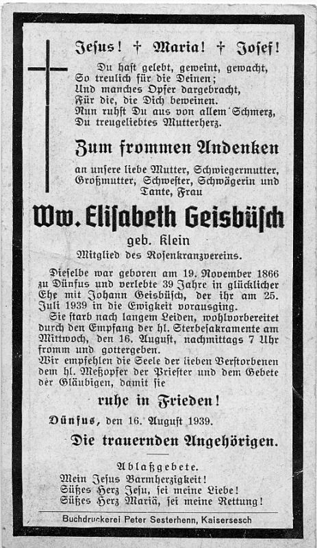 39 J. verh. mit Johann Geisbüsch, † 25.7.1939; langes Leiden (Druck in Kaisersesch) |
