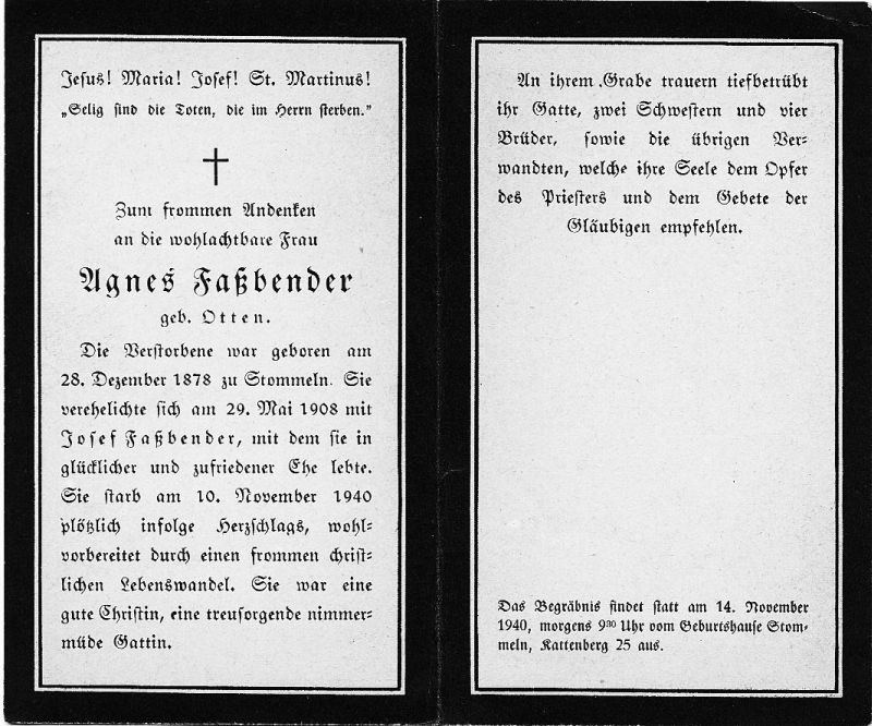 ∞ 29.5.1908 Josef Faßbender; Begräbnis vom Geburtshaus Stommeln, Kattenberg 25 aus |