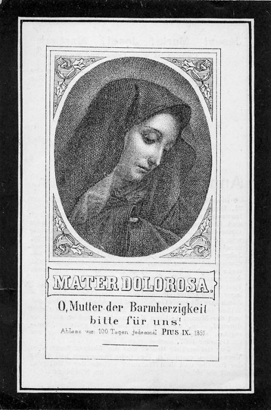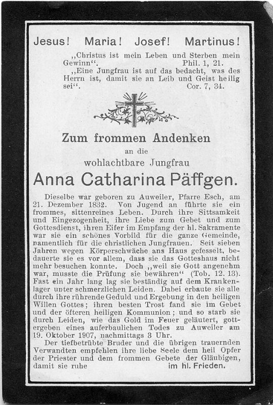 Jungfrau; seit 7 J. ans Haus gefesselt, 1 J. bettlägerig; lebte bei ihrem Bruder Johann Wilhelm, der nach ihr am 2.4.1909 starb. |