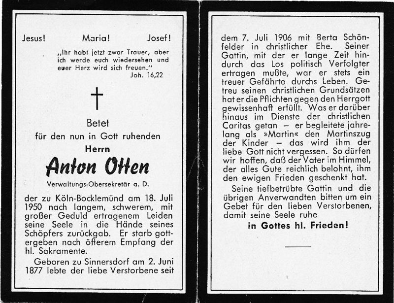 ∞ 7.7.1906 Berta Schönfelder; mit ihr ertrug er lange Zeit das Los politisch Verfolgter; begleitete jahrelang als "Martin" den Martinszug der Kinder |