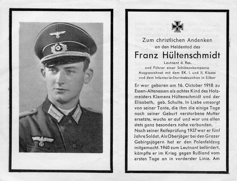 Gefallener 2. Weltkrieg; Eltern: Holzmeister Klemens Hültenschmidt u. Elisabeth geb. Schulte; Mutter n. Geburt †, umsorgt von Tante; 1937 Abitur; 1940 Leutnant; Heldenfriedhof in Tour a.d. Mündung der Tigora i.d. Wolchow |