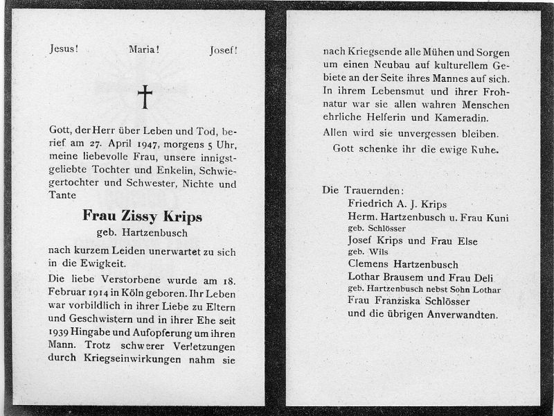 ∞ 1939 Friedrich A. J. Krips; schwere Verletzung durch Kriegseinwirkung im 2. Weltkrieg; nach dem Krieg Neubau auf kulturellem Gebiet an der Seite ihres Mannes |