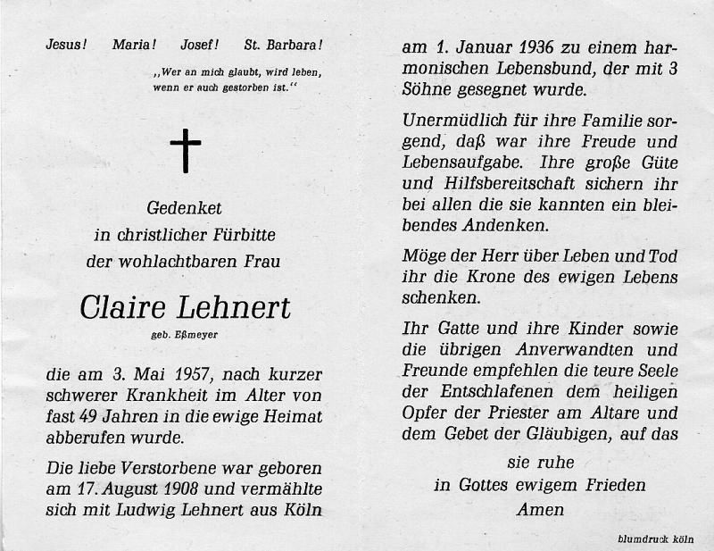 ∞ 1.1.1936 Ludwig Lehnert aus Köln; 3 Söhne |