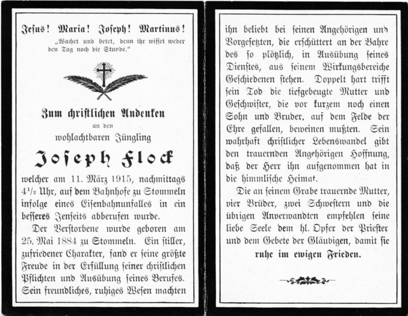 Gestorben auf dem Bahnhofe zu Stommeln infolge eines Eisenbahnunfalles; ein Bruder kurz zuvor im 1. Weltkrieg gefallen |