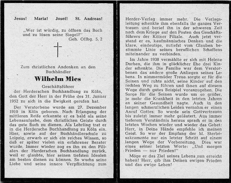Geschäftsführer der Herderschen Buchhandlung in Köln; nach mittlerer Reife dort Lehrling; Buchhändlerschule zu Leipzig; ∞ 1938 Helene Durben; 3 K.; in den letzten Jahren Krankheit; langes Leiden |
