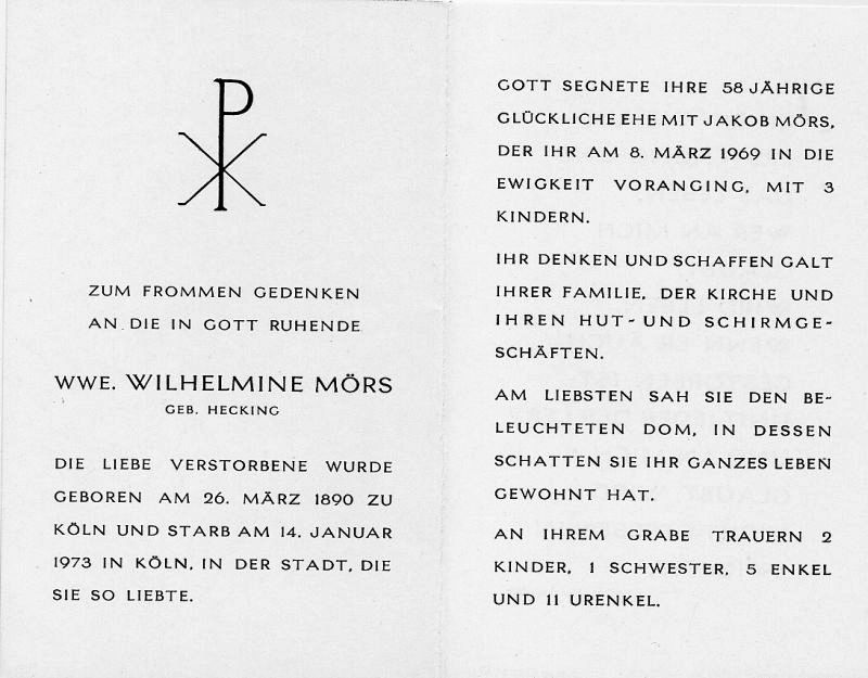 58 J. verh. mit Jakob Mörs, † 8.3.1969; 3 K.; lebte ihr ganzes Leben lang im Schatten des Domes |