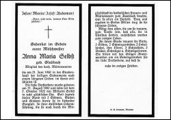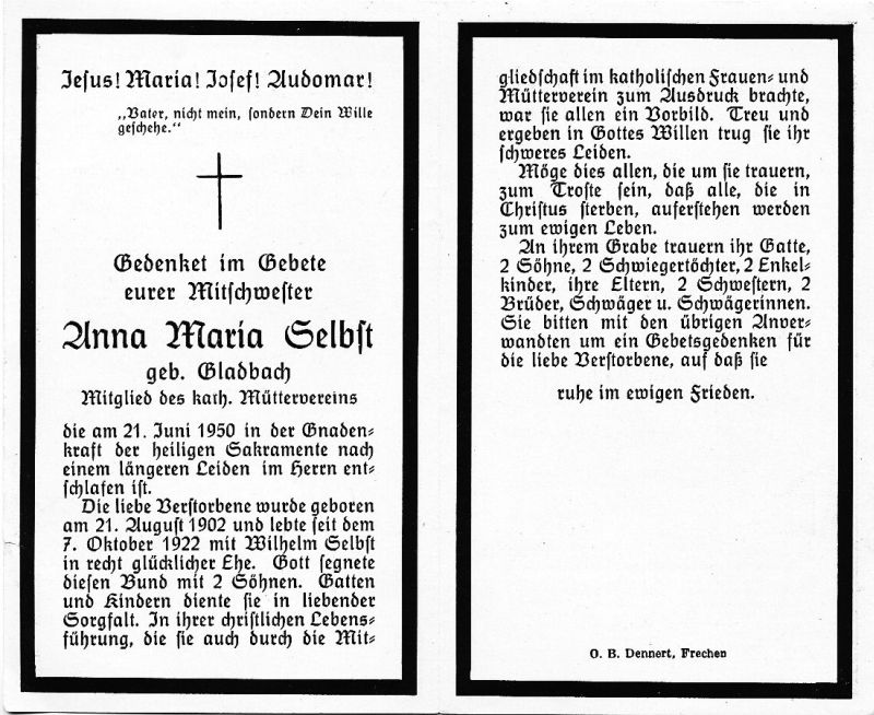 ∞ 7.10.1922 Wilhelm Selbst; 2 Söhne; Mitglied des kath. Müttervereins |