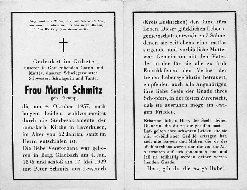 ∞ 17.5.1929 Peter Schmitz aus Lessenich, Kr. Euskirchen; 3 Söhne |