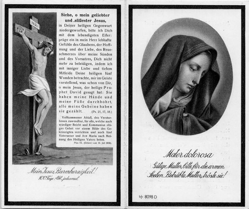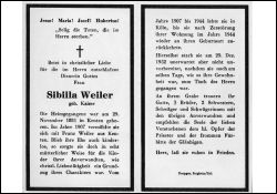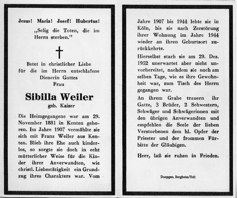| ∞ 1907 Franz Weiler aus Kenten; kinderlos, sorgte für die Kinder ihrer Anverwandten; lebte 1907-1944 in Köln, nach Zerstörung ihrer Wohnung 1944 Rückkehr in Geburtsort |