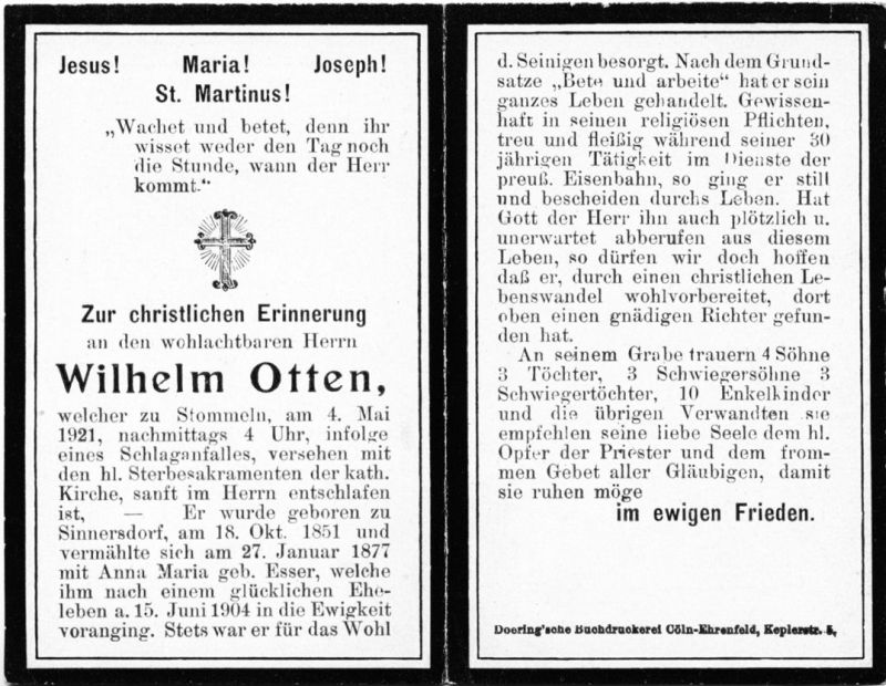 ∞ 27.1.1877 Anna Maria Esser, † 15.6.1904; 30 Jahre tätig im Dienste der preußischen Eisenbahn |