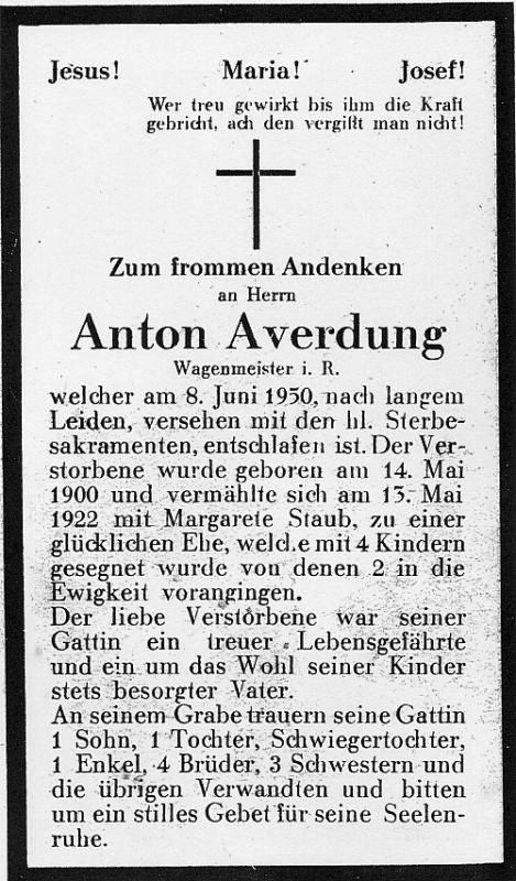 | Wagenmeister i.R.; ∞ 13.5.1922 Margarete Staub; 4 K., davon 2 † |