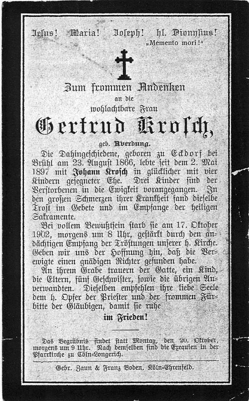 | ∞ 2.5.1897 Johann Krosch; 4 K., davon 3 †; sehr schmerzhafte Krankheit |