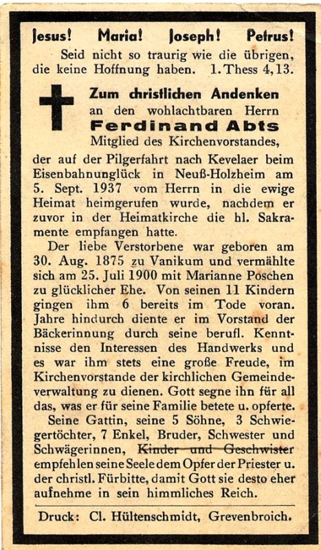 Eisenbahnunglück auf Pilgerfahrt nach Kevelaer; Mitgl. Kirchenvorstand; ∞ 25.7.1900 Marianne Poschen; 11 K., davon 6 †; Vorstand der Bäckerinnung; Druck in Grevenbroich |