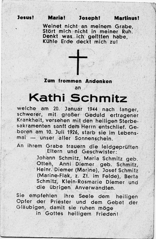 Eltern: Johann Schmitz u. Maria geb. Otten; Geschw.: Anni Diemer geb. Schmitz, Heinr. Diemer, Josef Schmitz, Berta Schmitz, Klein-Rosemarie Diemer |