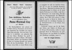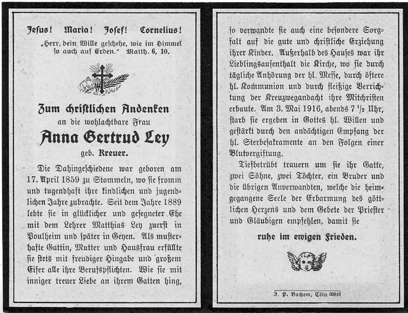 Blutvergiftung; ∞ 1889 Lehrer Matthias Ley, zuerst in Pulheim, dann in Geyen; |