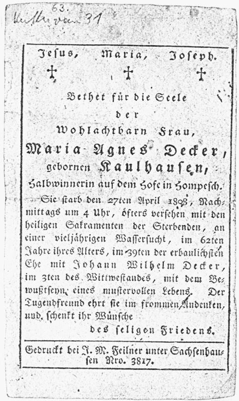 Halbwinnerin auf dem Hof in Hompesch; 62 J.; 39 J. verheiratet mit Johann Wilhelm Decker, im 3. Jahr Witwe |