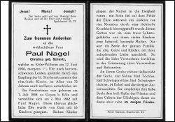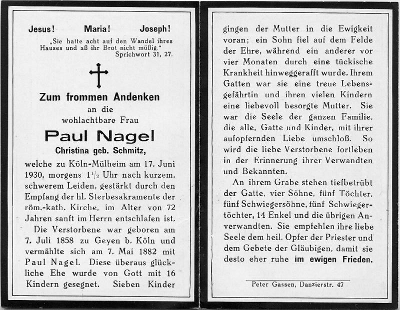| ∞ 7.5.1882 Paul Nagel; 16 K., davon 7 †; 1 Sohn im 1. Weltkrieg gefallen; ein weiterer Sohn vor 4 Mon. † |