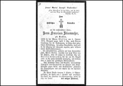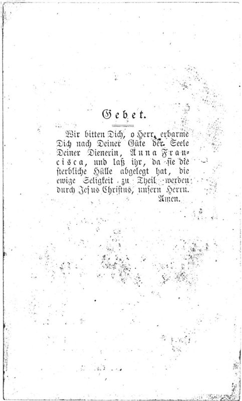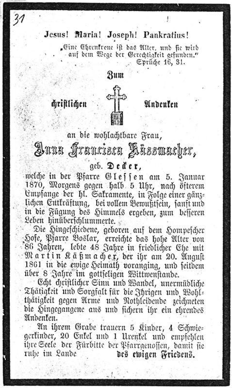 86 J.; 48 J. Ehe mit Martin Käßmacher (s. auch: Käsmacher), † 20.8.1861; 8 Jahre Witwe; gestorben in Folge einer gänzlichen Entkräftung |