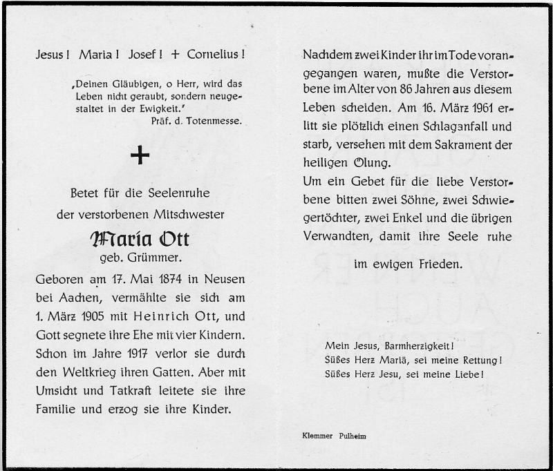 | ∞ 1.3.1905 Heinrich Ott, im 1. Weltkrieg 1917 gefallen; 4 K., davon 2 †; Schlaganfall (Geyen) |