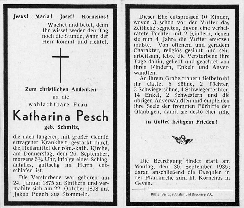 | ∞ 22.10.1898 Jakob Pesch aus Stommeln; 10 K., davon 3 † , darunter 1 verh. Tochter mit 2 Kindern, denen sie 4 J. die Mutter ersetzte |