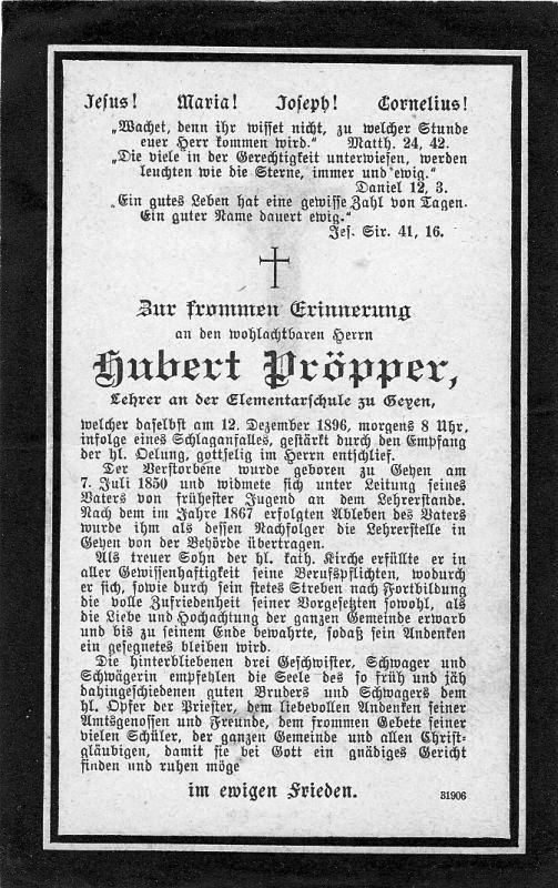 Unter Leitung seines Vaters widmete er sich von frühester Jugend an dem Lehrerstande; Nach Tod des Vaters 1867 dessen Nachfolger als Lehrer an der Elementarschule zu Geyen; Schlaganfall |