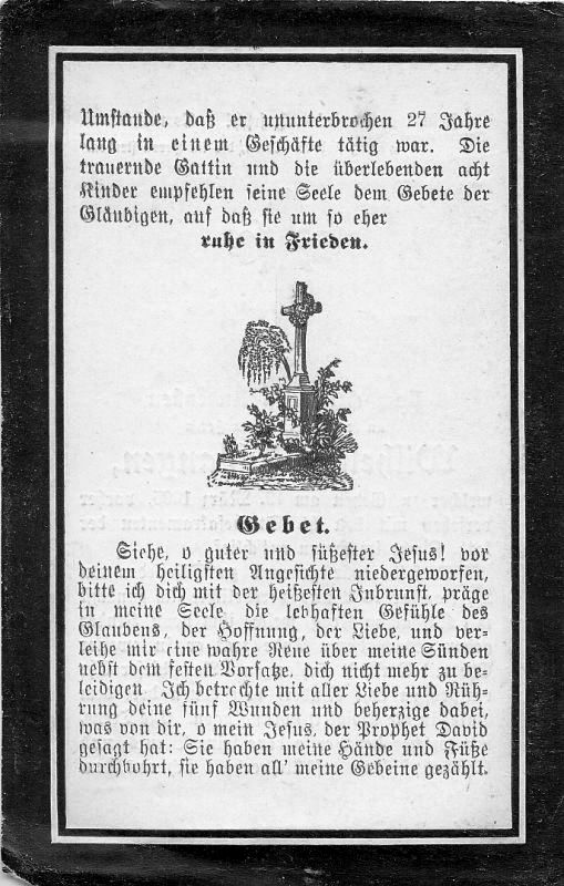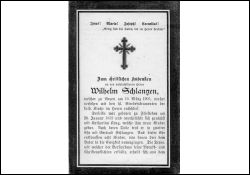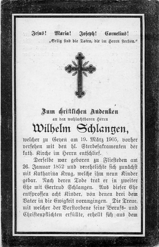 | Totenzettel-Nr.: | 8373 |  | Name: | Schlangen |  | Vorname: | Wilhelm |  | Geburtsort: | Fliesteden |  | Geburtsdatum: | 26.01.1852 |  | Sterbeort: | Geyen |  | Sterbedatum: | 19.03.1905 |  | Bearbeiter: | Josef Wißkirchen |  | Sammlung: | Johannes Nelles, Pulheim-Geyen |  | Sonstiges: |  | ∞ Katharina Krug, † ; 9 K.; ∞ Gertrud Schlangen; 8 K., davon 3 †; 27 J. ununterbrochen in einem Geschäft tätig |  |